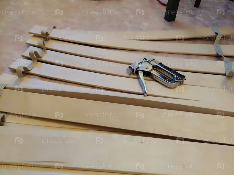 Самостоятельный ремонт основания кровати. Ремонт реечного дна кровати с помощью мебельного степлера. Мебельный степлер на реечное основание кровати. Соединительные рейки с текстильной отделкой