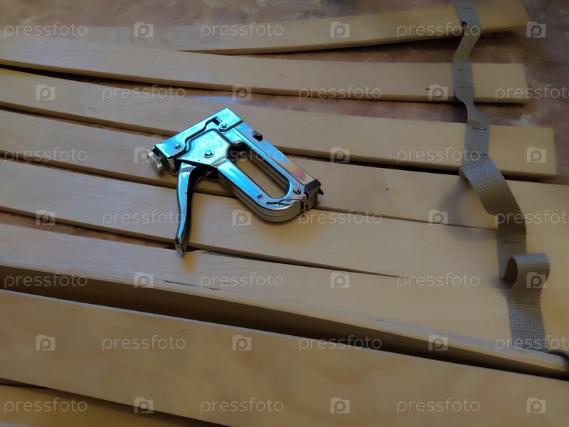 Самостоятельный ремонт основания кровати. Ремонт реечного дна кровати с помощью мебельного степлера. Мебельный степлер на реечное основание кровати. Соединительные рейки с текстильной отделкой