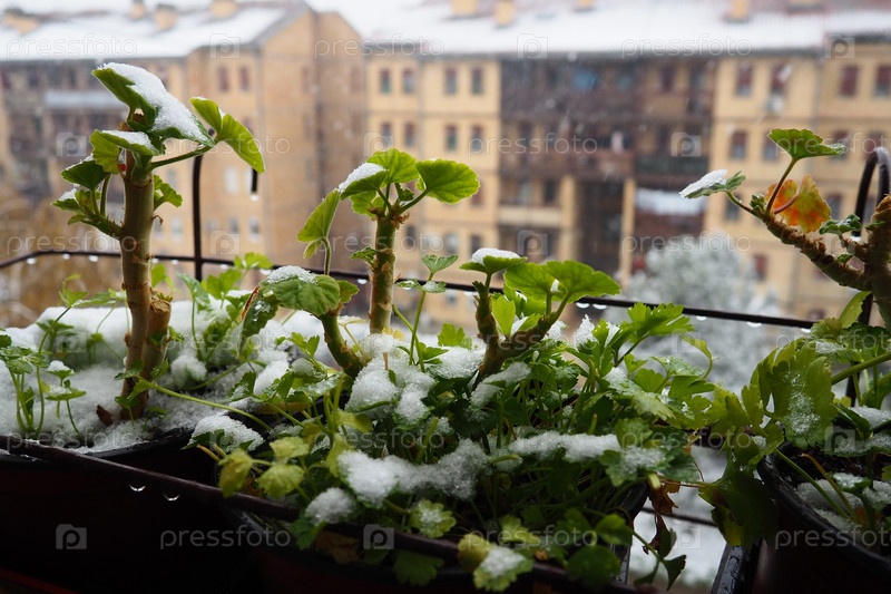 Внезапный снегопад и метель. Подмерзание свежих побегов. Многоэтажные жилые дома. Большие снежинки летают и кружатся. Герань или пеларгония – холодостойкое растение. Зеленые листья петрушки