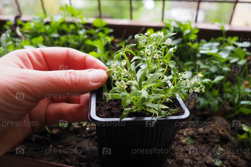 Пересадка алиссума из пластикового горшка в ящик для цветов на балконе. Женщина держит рассаду. Алиссум — род цветковых растений семейства крестоцветных, насчитывающий более ста видов
