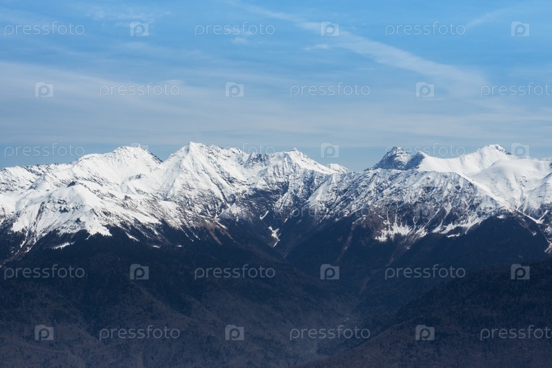 Красивые снежные вершины Кавказских гор. Горнолыжный курорт Красная Поляна Роза Хутор, Россия