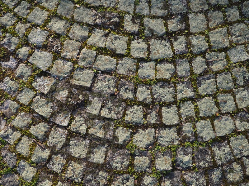 Аккуратно выложена старая брусчатка. Тротуар на площади старого города. Квадратные и прямоугольные камни на земле, покрытые мхом и лишайниками