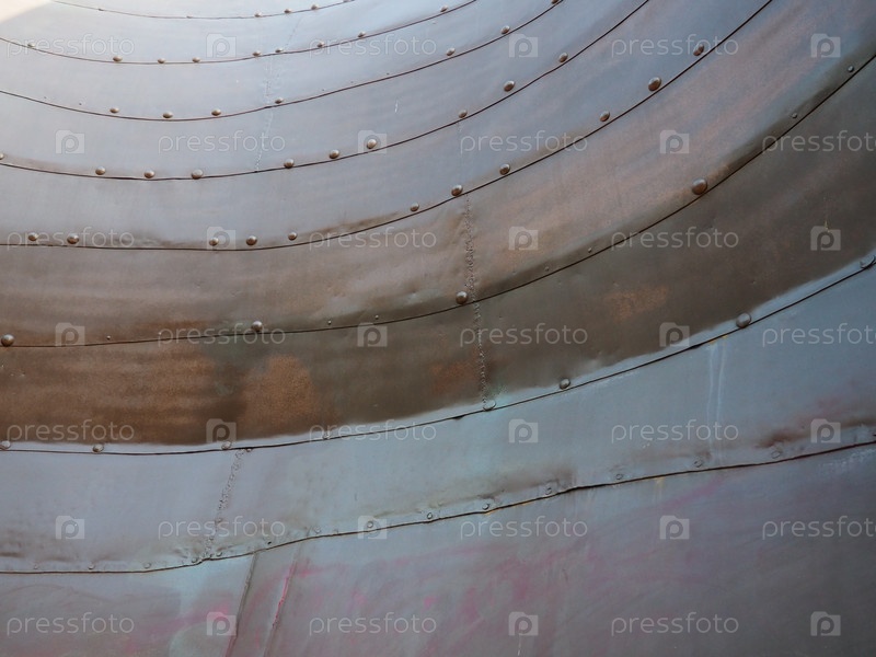 Металлическая поверхность с заклепками и болтами. Абстрактный фон военного или промышленного характера. Обшивка с вмятинами, швами и гайками. Крепления на металл. Стальная или бронзовая панель