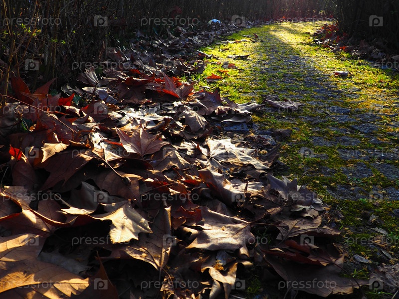 Сухие кленовые листья на мощеной парковой дороге. Мох на камнях. Низкий солнечный луч. Осень или бесснежная зима. Меланхоличный пейзаж с перспективой вдаль