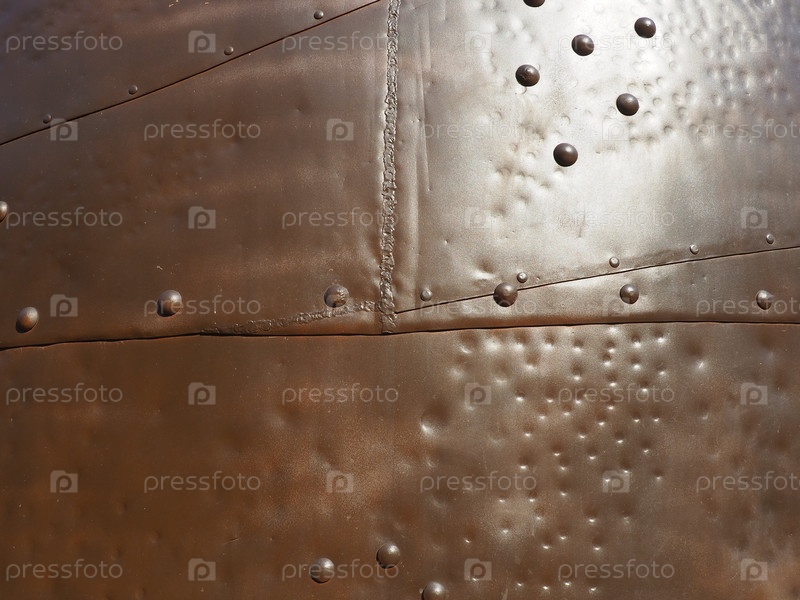 Металлическая поверхность с заклепками и болтами. Абстрактный фон военного или промышленного характера. Обшивка с вмятинами, швами и гайками. Крепления на металл. Стальная или бронзовая панель