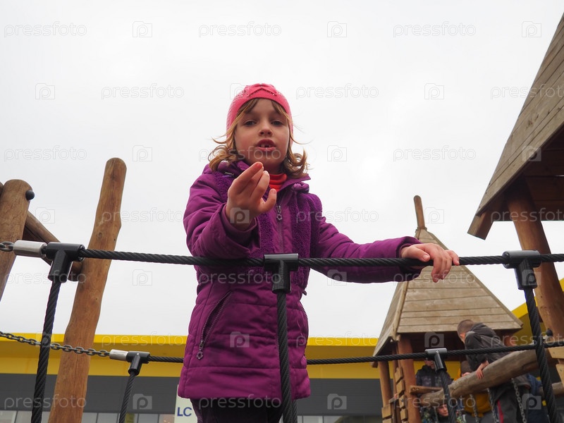 Девочка 7 лет на детской площадке. Ребенок одет в теплую демисезонную одежду - сиреневую куртку и розовую шапочку. Скалодром для детей. Девушка протягивает правую руку вперед