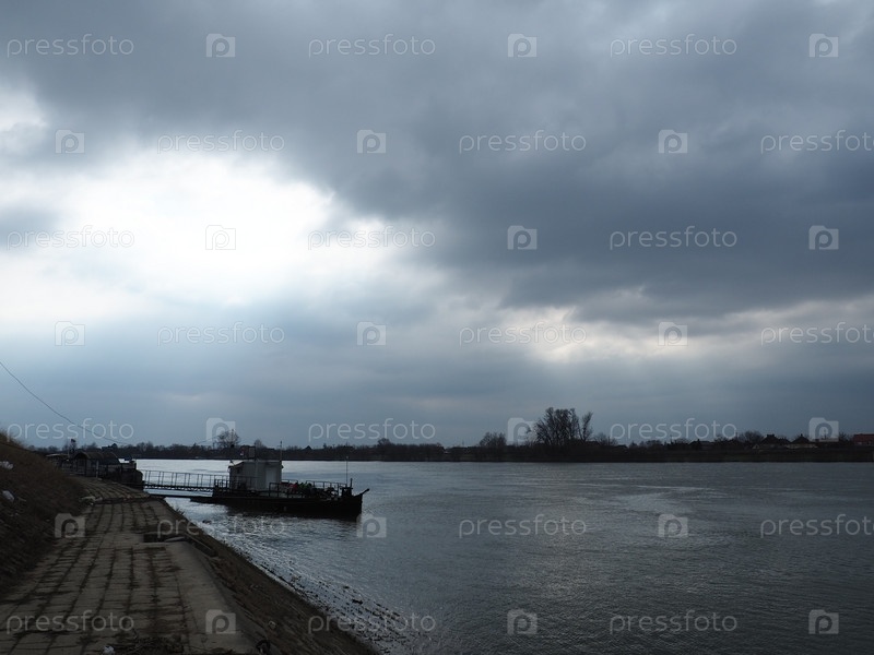 Речной пейзаж с одиноким кораблем на якоре. Пасмурная погода с тяжелыми облаками. Отражение облаков в воде. Противоположный берег – это горизонт. Река Сава, берег Сремска-Митровицы, Сербия