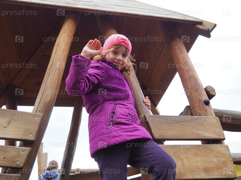 Девочка 7 лет на детской площадке. Ребенок одет в теплую демисезонную одежду - сиреневую куртку и розовую шапочку. Деревянная площадка для скалолазания. Девушка машет правой рукой