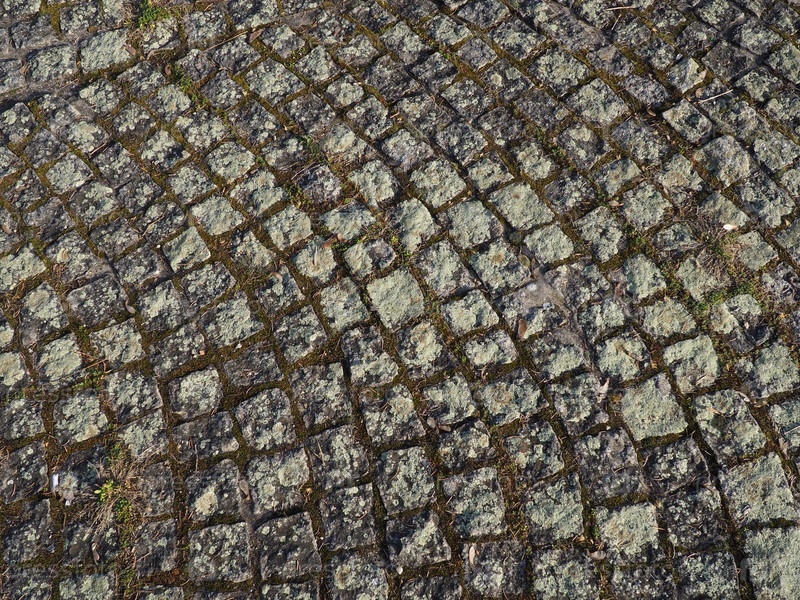 Аккуратно выложена старая брусчатка. Тротуар на площади старого города. Квадратные и прямоугольные камни на земле, покрытые мхом и лишайниками