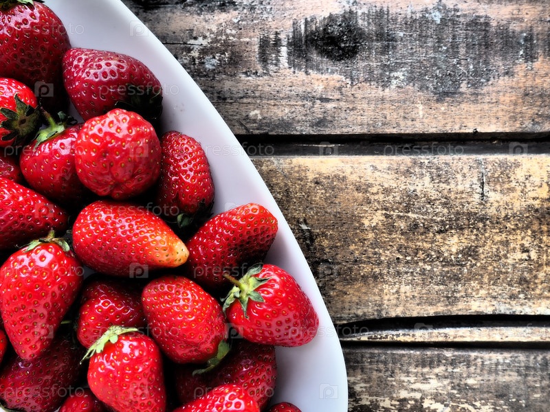 Клубника на тарелке, деревянный фон. Белая посуда и вкусная красная крупная садовая клубника. Здоровое питание, витамины и вегетарианская диета. Натюрморт с едой. Скопируйте пространство. Плоская укладка