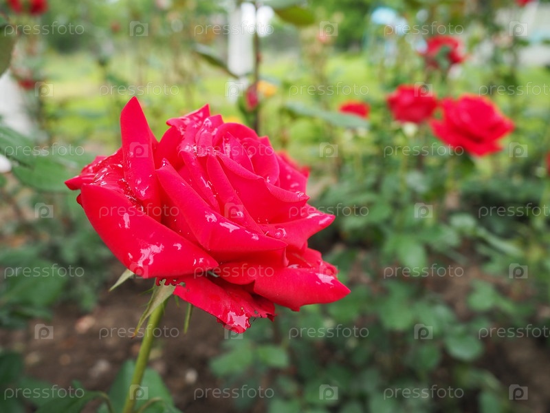 Цветущая романтическая свежая румяная роза. В саду цветут розовые и малиновые розы. Лепестки с каплями воды