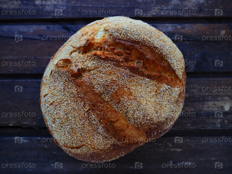 Вид сверху на круглый хлеб. Вкусный свежий кукурузный хлеб с посыпкой на старом деревянном столе. Скопируйте пространство. Традиционные рецепты. Хлеб ручной работы
