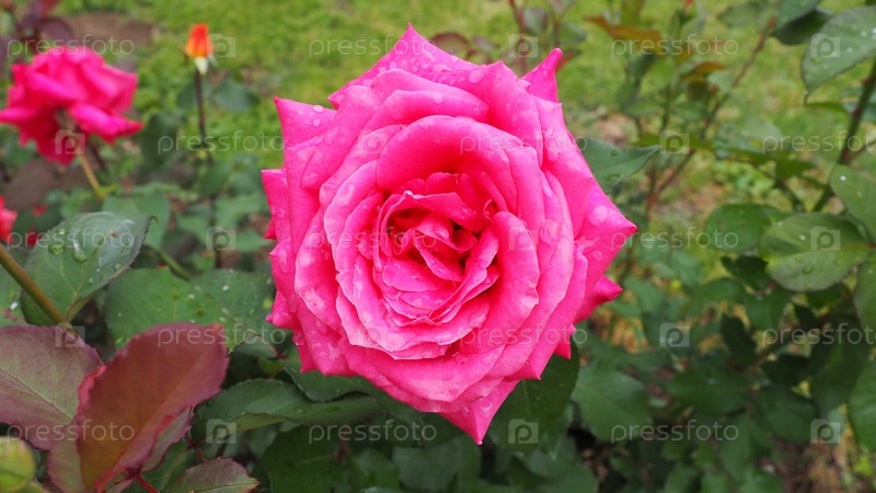 Цветущая романтическая свежая румяная роза. В саду цветут розовые и малиновые розы. Лепестки с каплями воды