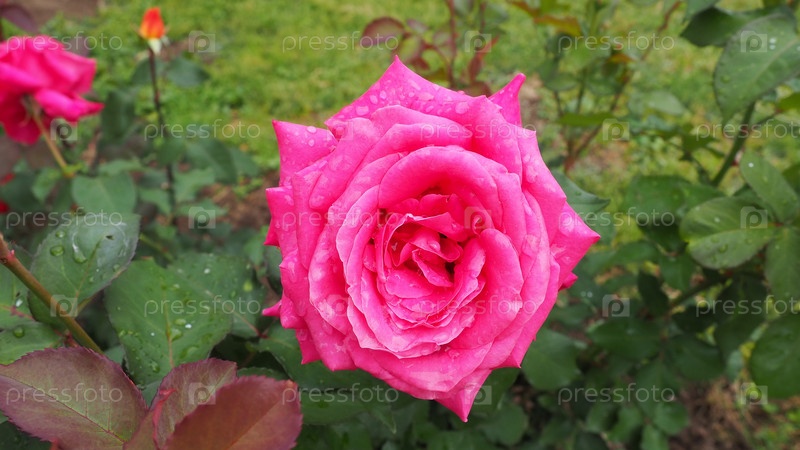 Цветущая романтическая свежая румяная роза. В саду цветут розовые и малиновые розы. Лепестки с каплями воды