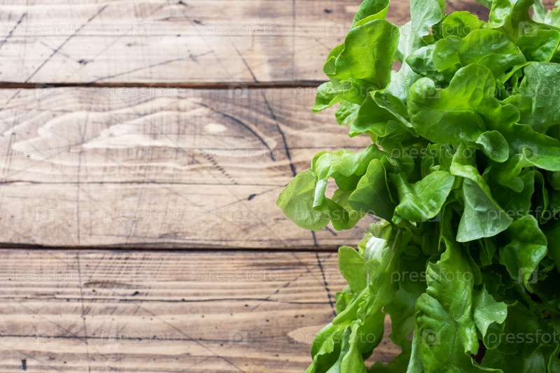 Свежие листья зеленого дубового салата. Деревянный фон с копировальным пространством