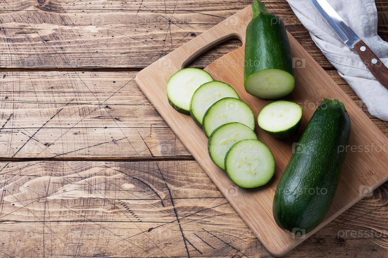 Свежий зеленый кабачок нарезать ломтиками на разделочной доске. Деревянный деревенский фон стола. Копировать пространство