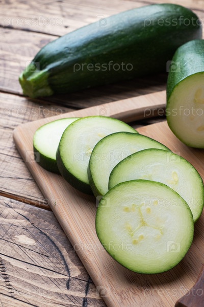 Свежий зеленый кабачок нарезать ломтиками на разделочной доске. Деревянный деревенский фон стола