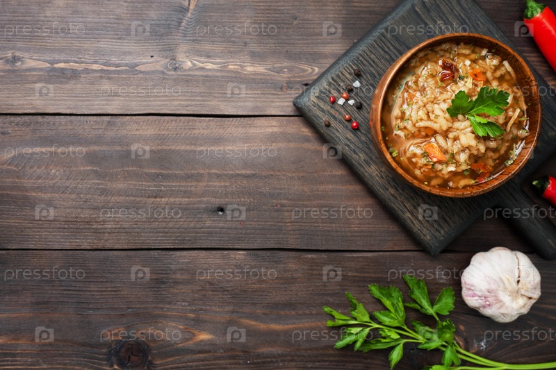 Вегетарианский суп харчо с рисом и овощами. Помидоры с острым перцем и чесноком. Скопируйте пространство. Деревянный деревенский фон, тарелки из натурального бамбука