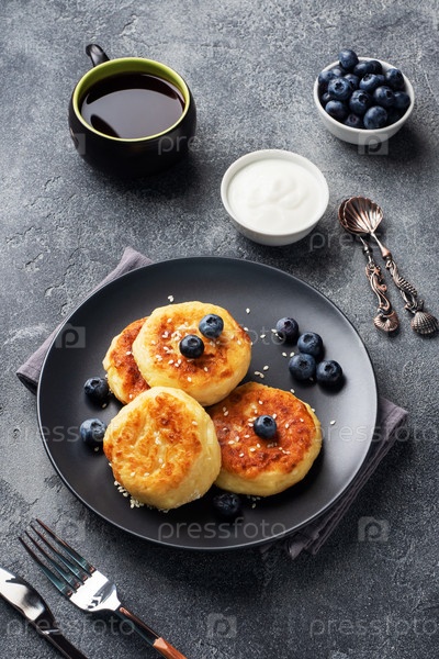Оладьи из творога с черникой. Чизкейки с творогом, блины на темном бетонном фоне. Скопируйте пространство