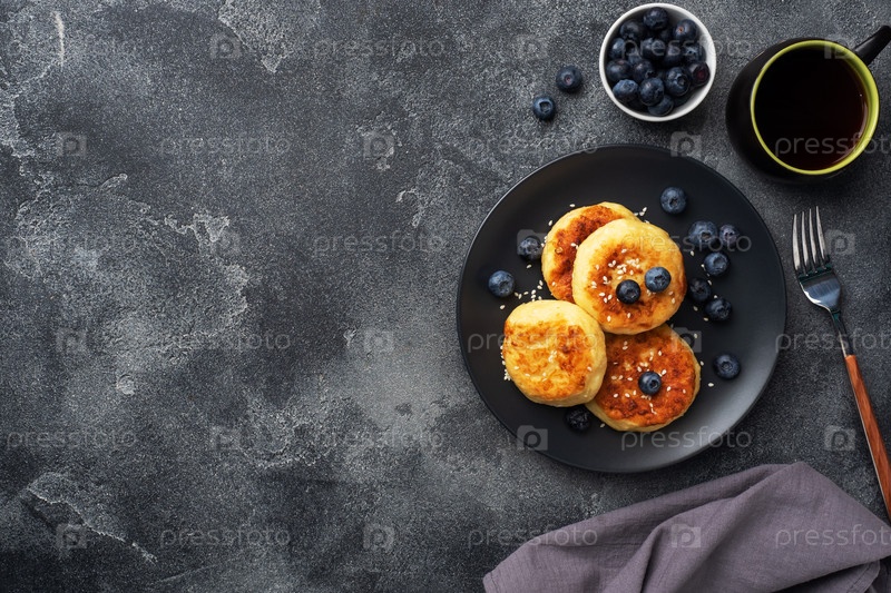 Оладьи из творога с черникой. Чизкейки с творогом, блины на темном бетонном фоне. Скопируйте пространство