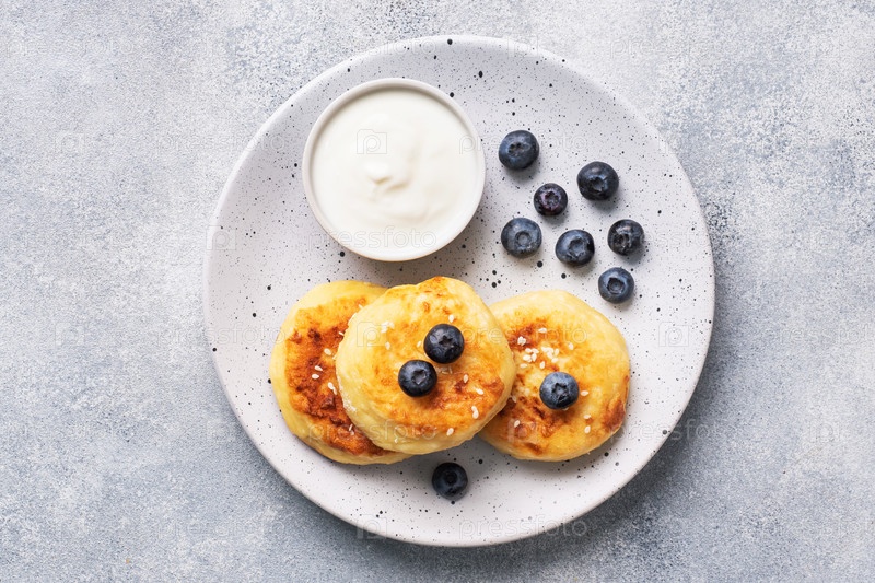 Оладьи из творога с черникой. Чизкейки с творогом, блины на сером бетонном фоне. Скопируйте пространство
