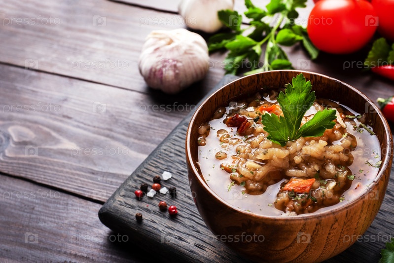 Вегетарианский суп харчо с рисом и овощами. Помидоры с острым перцем и чесноком. Скопируйте пространство. Деревянный деревенский фон, тарелки из натурального бамбука
