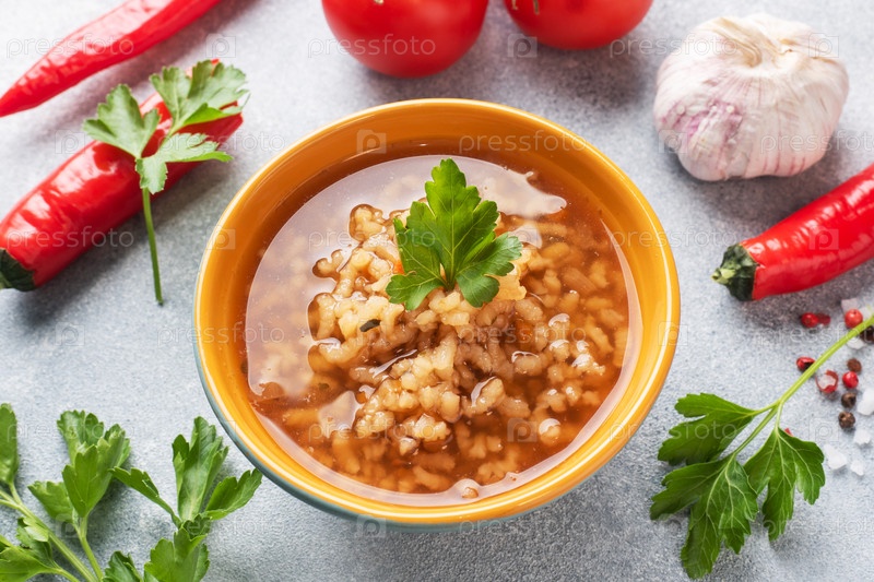 Вегетарианский суп харчо с рисом и овощами. Помидоры с острым перцем и чесноком. Серый бетонный стол, Керамическая посуда