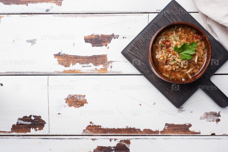 Вегетарианский суп харчо с рисом и овощами. Помидоры с острым перцем и чесноком. Скопируйте пространство. Деревянный деревенский фон, тарелки из натурального бамбука