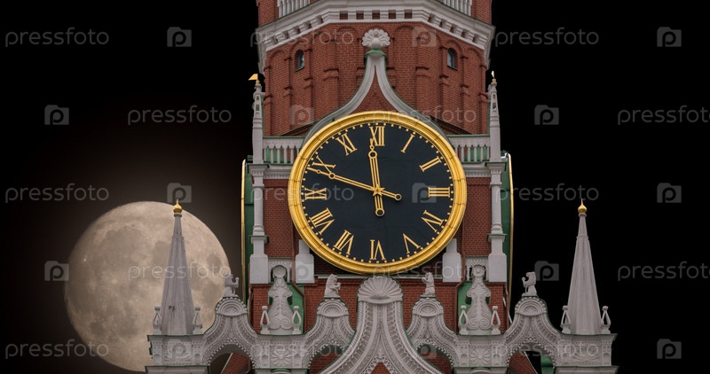 Главные часы Московского Кремля имени Куранти на Спасской башне 12 часов. Красная площадь. Промежуток времени
