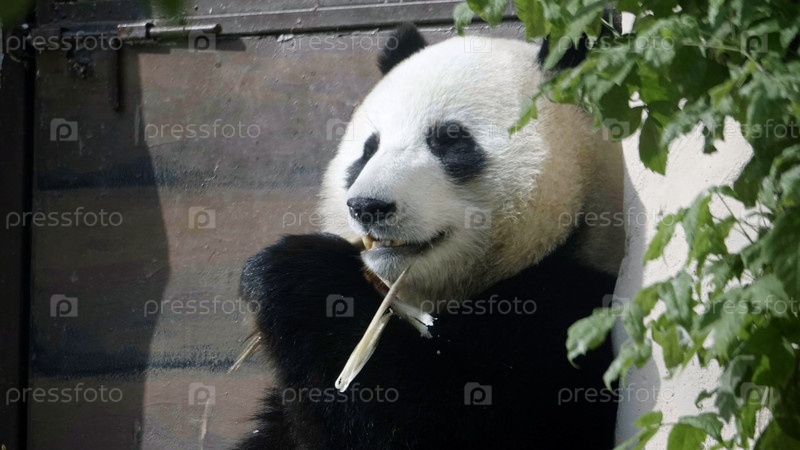 Панда ест сочные бамбуковые ветки на обед