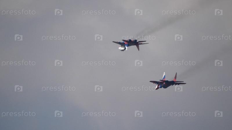 Москва Россия Жуковский аэродром 31 августа 2019 года: пилотажная группа МиГ-29 выполняет демонстрационный полет международного аэрокосмического салона МАКС-2019