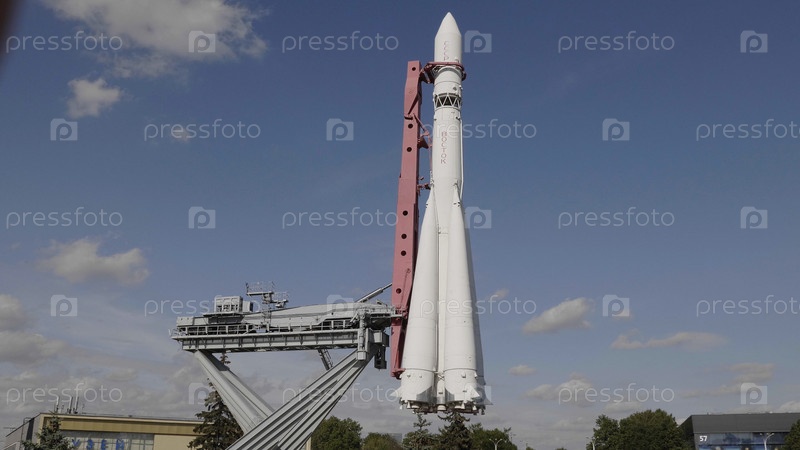 МОСКВА, РОССИЯ - 23 апреля 2019 г.: Ракета-носитель "Восток" в павильоне "Космос" на ВДНХ. Прогулки москвичей и туристов