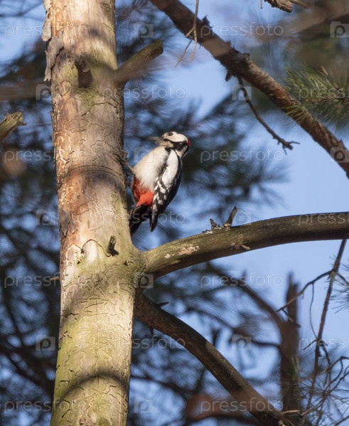 Большой пестрый дятел ищет еду на дереве
