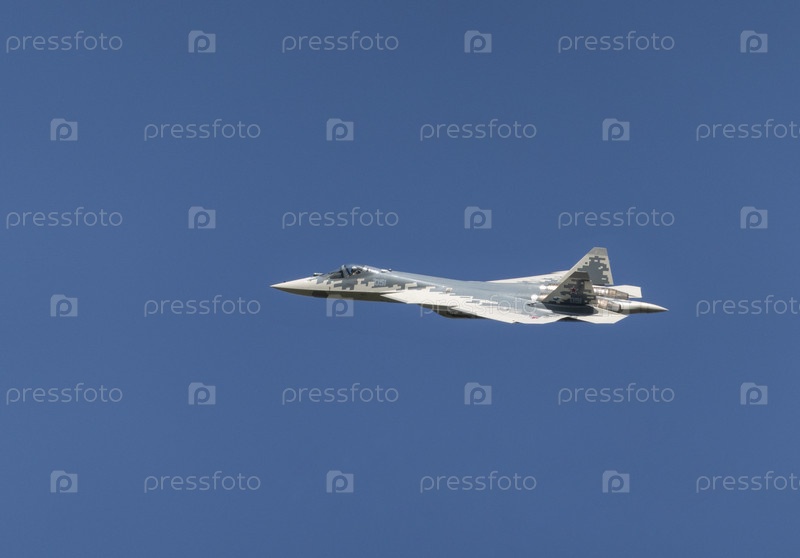 Москва Россия Аэродром Жуковский 31 августа 2019 года: Демонстрация новейшего российского истребителя Су-57 на международном аэрокосмическом салоне МАКС-2019