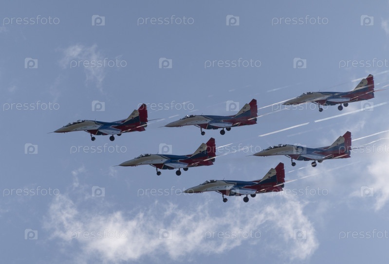 Москва Россия Жуковский аэродром 31 августа 2019 года: пилотажная группа МиГ-29 выполняет демонстрационный полет международного аэрокосмического салона МАКС-2019