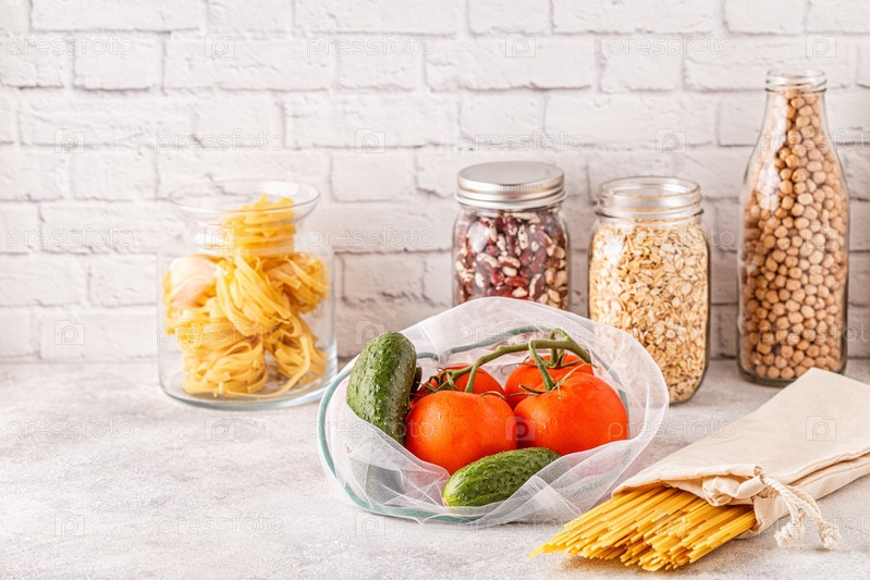Изделия в тканевых мешках, стеклянная посуда. Экологичные покупки и хранение продуктов