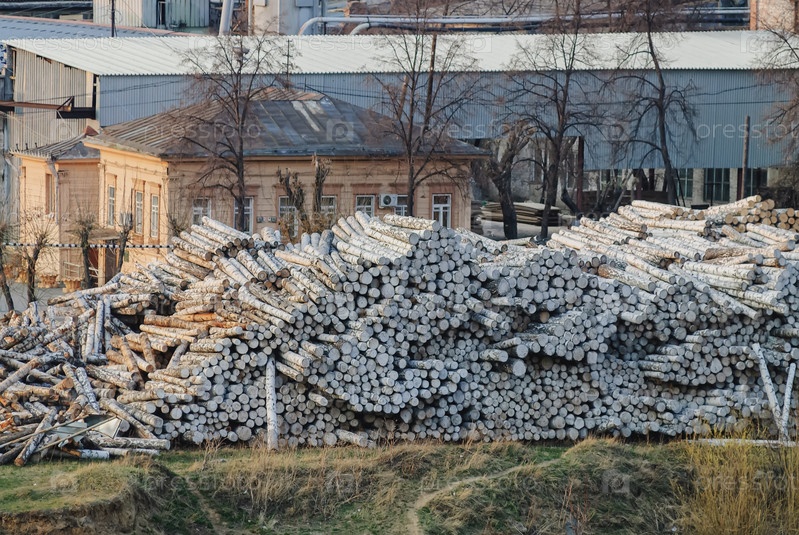 Куча деревянных бревен на фанерном комбинате. Тюмень