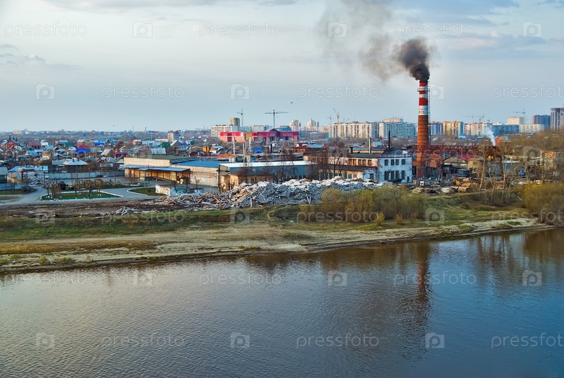 Тюмень, Россия - 6 мая 2008 г.: Фанерный завод на берегу реки. Сейчас он переведен в промзону пригорода, а здания снесены