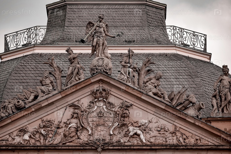 Фрагмент здания, крыша которого украшена барельефами и статуями