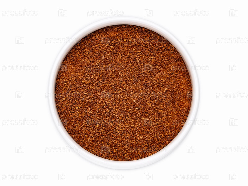 Кокосовый сахар крупным планом в белой чашке на белом фоне, вид сверху, плоская планировка, изоляция. Нектар цветов кокоса