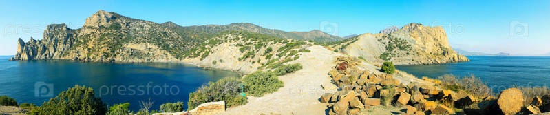 Панорама гор и моря. Мыс Чикен и гора Караул-Оба в Крыму. Черное море, горы и голубое небо