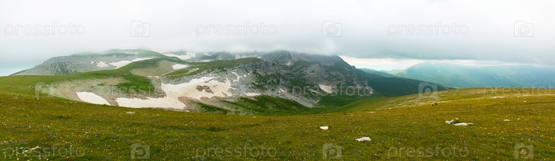 Панорама горного пейзажа. Зеленая трава с горными цветами на переднем плане, горы с остатками снега и нависшими над ними темными облаками