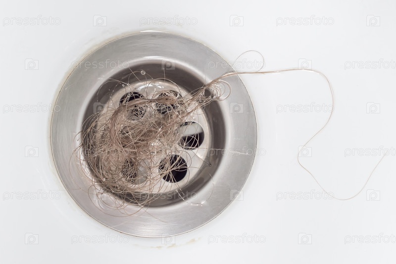 Пучок светлых женских волос остался в сливе ванной после душа. Крупный план, вид сверху. Проблема выпадения волос