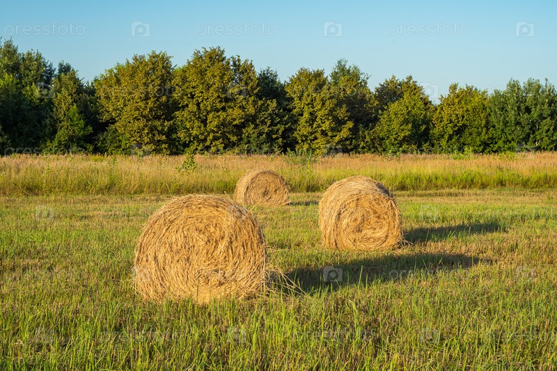 Три сухих тюка желтого сена на скошенном поле. Деревья и голубое небо на заднем плане. Заготовка сена на зиму для кормления скота
