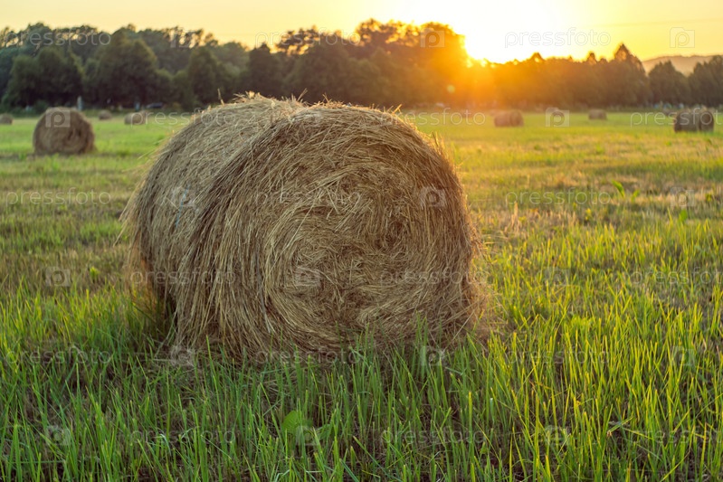 Сухие круглые тюки сена в поле зеленой травы во время заката. Заготовка сена на зиму для кормления скота