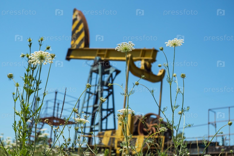 Желтая заброшенная нефтяная вышка в поле среди цветов на фоне голубого неба. Концепция упадка нефтяной промышленности. Нефть кончилась, техника осталась ржаветь