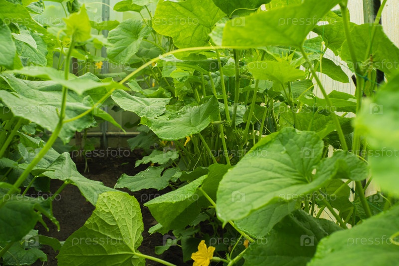 Ряд зеленых огурцов с подвязками в частной небольшой теплице. Бизнес по выращиванию огурцов в личном подсобном хозяйстве