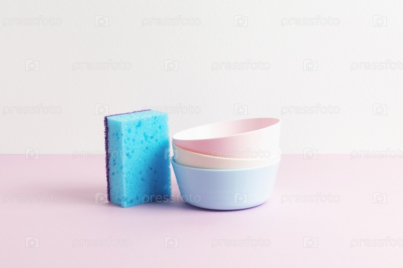 Губка из синей пены и разноцветные тарелки на розовом и белом фоне