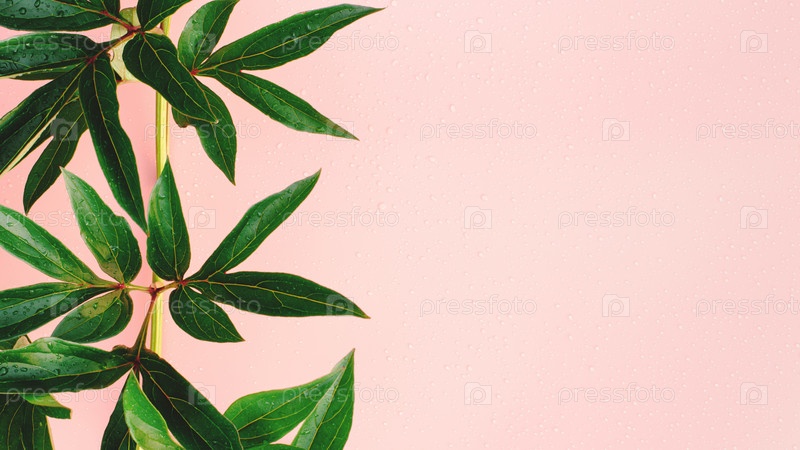 Зеленые свежие листья на розовом фоне с каплями дождя