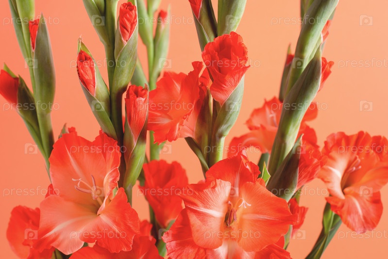 Цветочный фон, красные гладиолусы на оранжевом фоне, крупный план